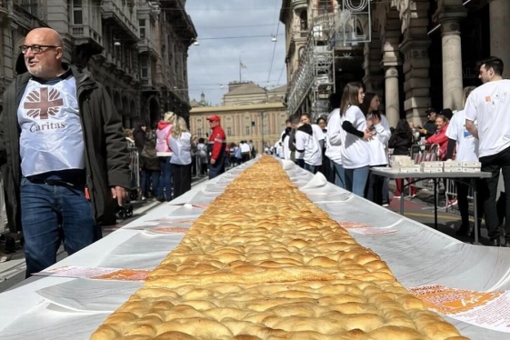 About 350 meters in length by one ton in weight and more than 15 thousand portions to be distributed for free: these are the numbers of the world's longest focaccia, produced by 14 bakers of the Genoa Bakers Association on Saturday, April 15 in the streets of the center of the Ligurian capital.In front of the Ducal Palace there was the official "pr...