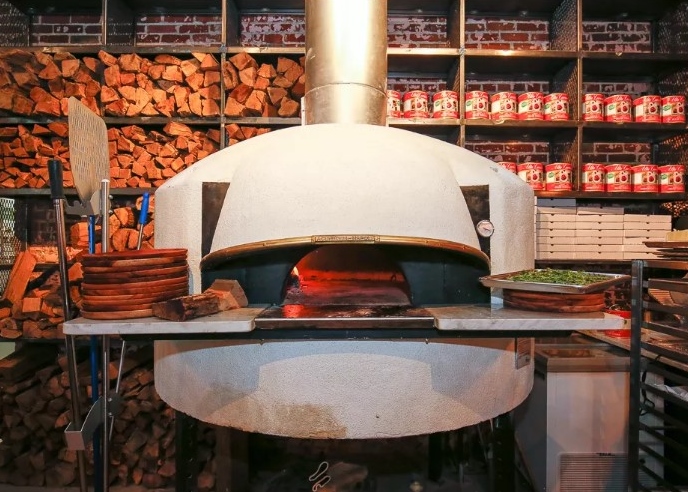 The bones of the old building, a place that once housed the catering operation for Strings, are honored by allowing the exposed brick and high ceilings with wooden beams to shine. Big new windows, a freshly poured floor, a C-shaped bar around the centerpiece oven, plus tables that weave in warm wood elements give the space a contemporary look.