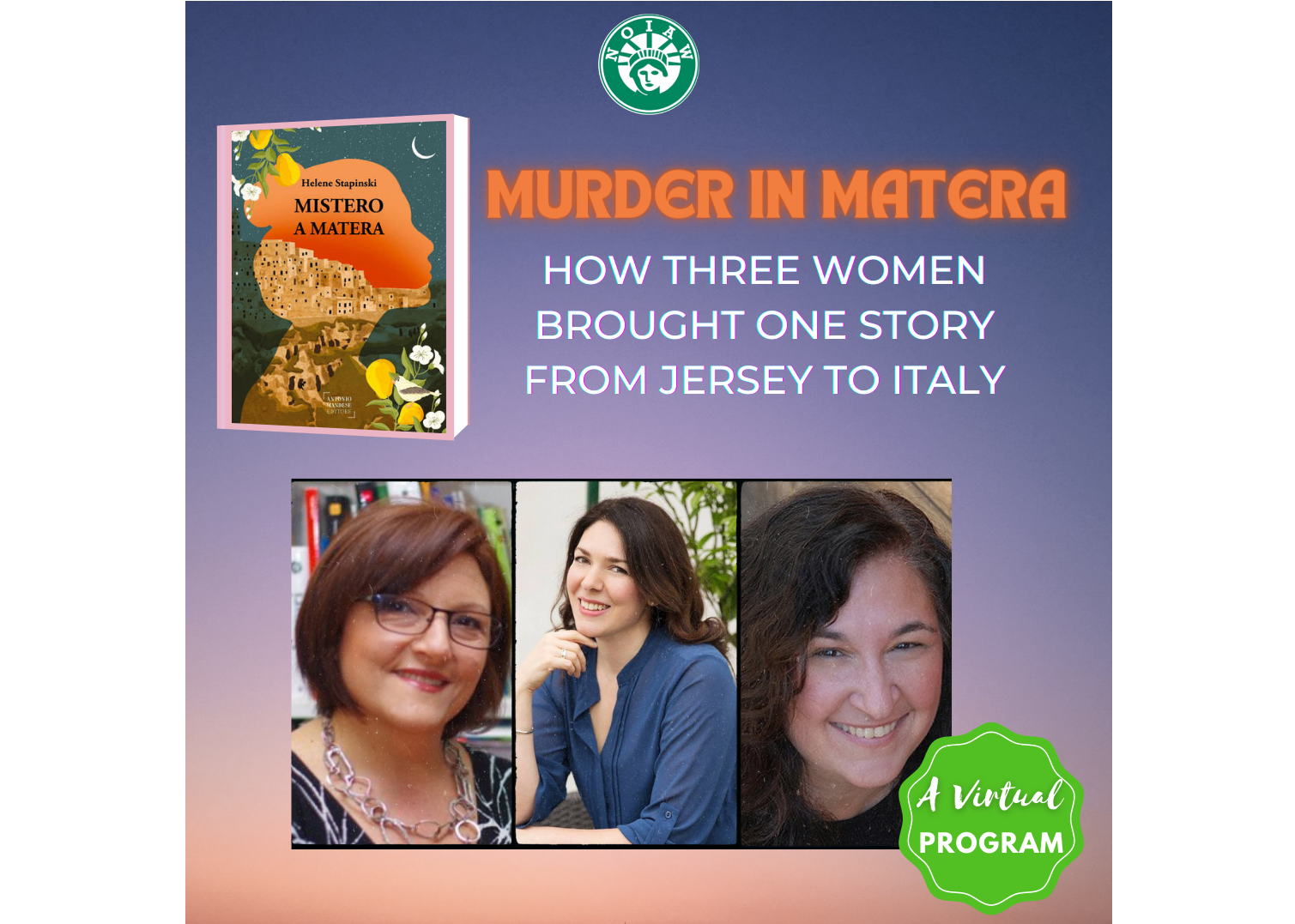 The Translation Journey of Murder in Matera. March 15th, 5:30pm-6:45pm EST. Virtual Event; Registration Required. Members: $10. Nonmembers: $15. Trip To Puglia Participants: Complimentary. Register Here! Join us for a virtual event and discover how the NOIAW network helped one Italian-American journalist turn her nonfiction account of a true life crime story into an international success!