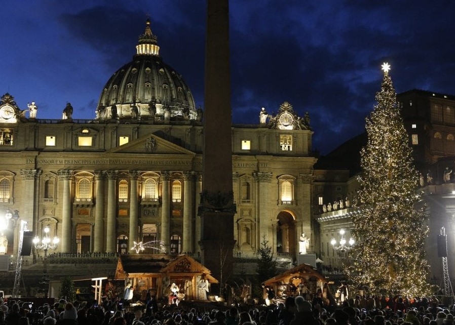The Vatican unveiled the Nativity scene and lit the Christmas tree with energy-saving lights in St. Peter's Square during a late afternoon ceremony Dec. 5. The 85-foot-tall spruce tree came from the forests of the Veneto region in northeast Italy and another 20 smaller trees were donated by communities in the region's province of Vicenza.