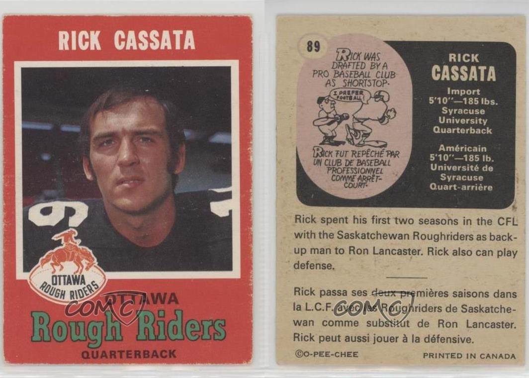 Rick “Rico” Cassata was inducted into the Greater Buffalo Sports Hall of Fame in 2002 for his quarterback play with the Ottawa Rough Riders of the Canadian Football League (CFL), winning the MVP award in the Grey Cup Championship in 1973 and highlighting a nine-year CFL career.