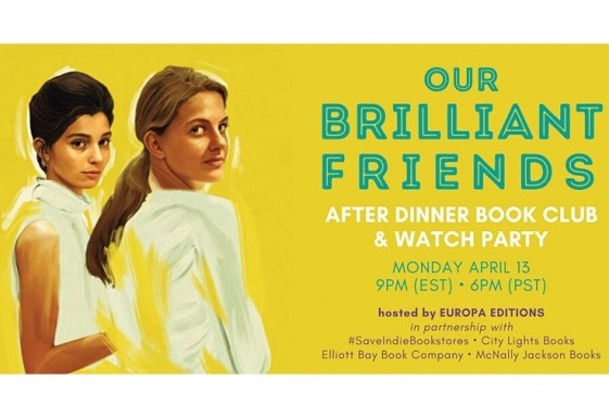 READ MOREMon, April 13, 2020. 9:00 PM – 11:00 PM EDT. Our Brilliant Friends - After Dinner Book Club and Watch Party. To benefit #SaveIndieBookstores. Join Elena Ferrante’s translator Ann Goldstein, Europa’s Editor in Chief Michael Reynolds, writer and poet Alexander Chee, and writer and producer Sarah Treem (The Affair) for an informal online conversation...