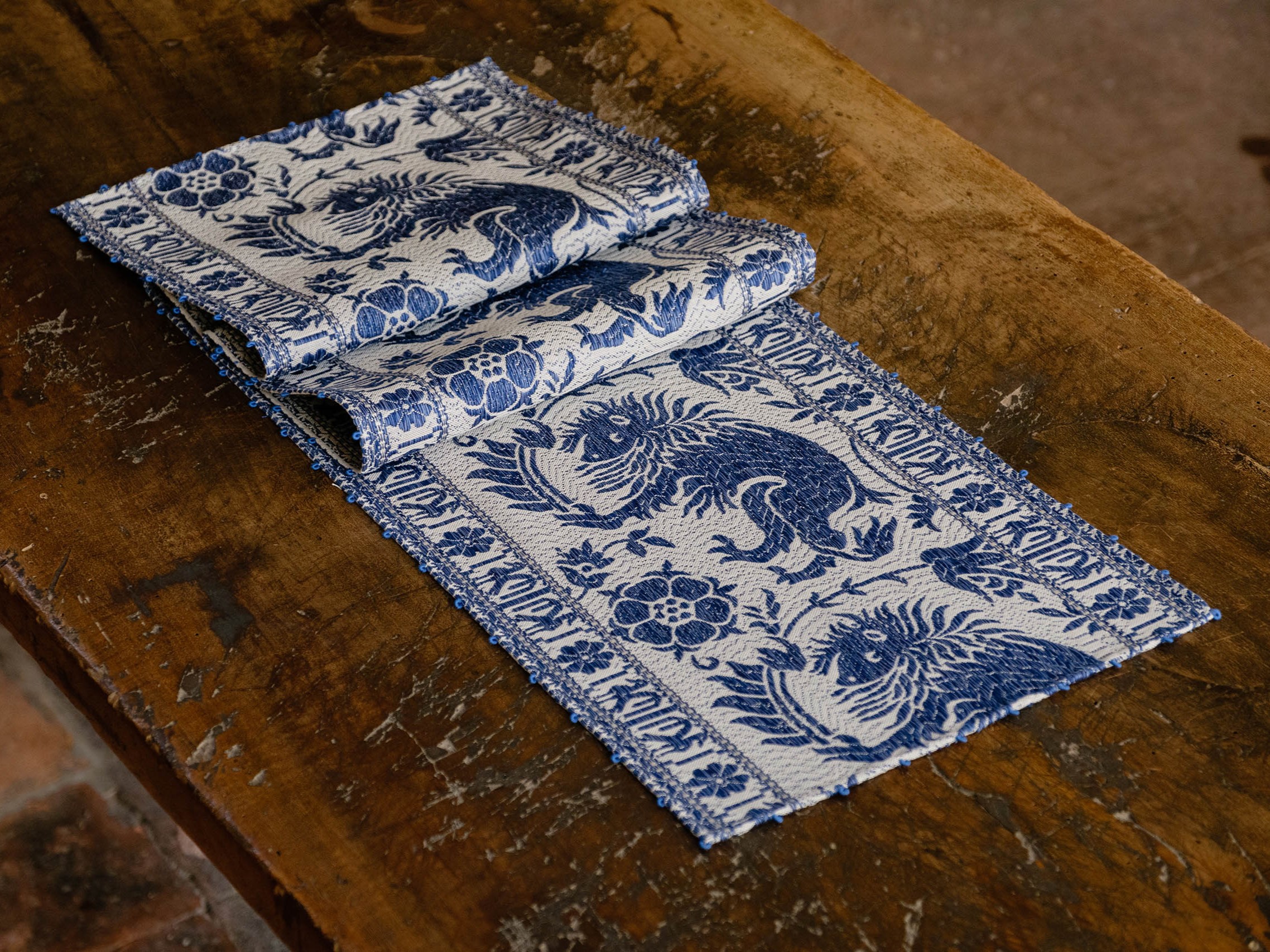 Today, traditional Umbrian weaving is still part of the region’s cultural and economic identity. Several family-run workshops continue to use 18th- and 19th-century foot-powered looms to create textiles in the same way they’ve been made for hundreds of years. The patterns—ranging from stylized humans and animals to good-luck phrases—are carefully woven with supplemental weft threads in cotton or linen blends. The blue bands alternating with ivory ones remain the signature of this historic fabric. Every piece is handmade, and crafting a single tablecloth can take up to 20 days.