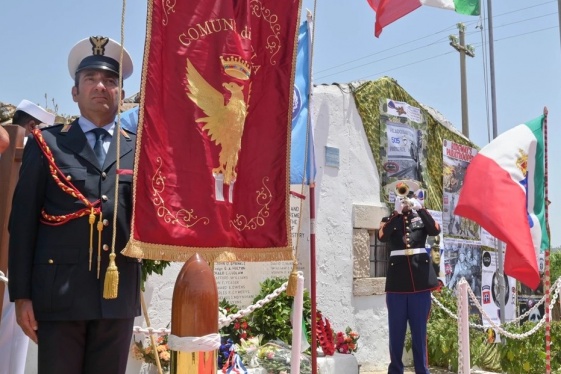U.S. and Italian service members, along with officials from Commander, Navy Region Europe, Africa, Central, the U.S. Consulate General in Naples, the British Embassy in Rome, and Naval Air Station Sigonella gathered at the 82nd Airborne Division Monument at Ponte Dirillo, in Gela, Italy, to celebrate the 80th anniversary of Operation Husky, July 10...
