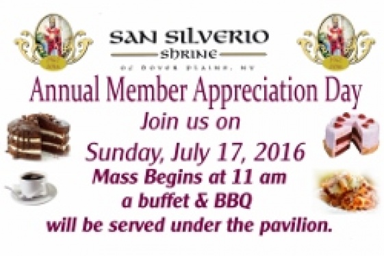 Join us on Sunday, July 17, 2016 for our Annual Members Appreciation Day and enjoy a fun filled day of delicious food, music, family, friends and being appreciated for your support of the San Silverio Shrine! Shrine Schedule & Activities 9:00 AM – Shrine opens10:30 AM - Rosary Service in Chapel11:00 AM - Holy Mass at Shrine Chapel ·...