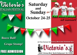 Come To The San Fernando Valley Victorio's Italian Festival Saturday AND Sunday October 24-25! Enjoy Italian food, music, comedy, beer, wine, a grape stomp, bocce ball and entertainment all day long hosted by The Meatballs Of Comedy! There will be a Kid's Corner with face painting, balloon animals and a bounce house as well as a wonderful shopping section with clothing, gifts, jewelry, collectibles and music CDs! Join us for a weekend filled with Family Fun Italian Style!! Victorio's italian Festival is located at the corner of Victory Blvd and Vineland Ave in North Hollywood and will run from noon until 10:00 PM. Admission is free. Vendors and sponsors are invited to contact the event coordinator to arrange for placement at [email protected] or (818) 945-3378
