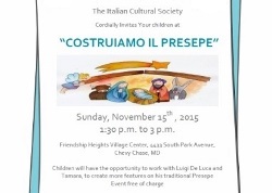 All children are invited to improve, paint and create additions to Luigi De Luca's traditional Presepe (crèche), that we usually display at our Christmas Party. This fun and unique opportunity will take place at the Friendship Heights Village Center, this Sunday, November 15th at 1:30. Tamara D'Addieco will also be there helping. Please RSVP to this email to reserve your place. We remind you that, afterwards, an Italian cartoon is waiting for you (Cattivissimo Me 2= Despicable Me 2) at 3:00pm. Visit our website for the complete program of the Social Meeting