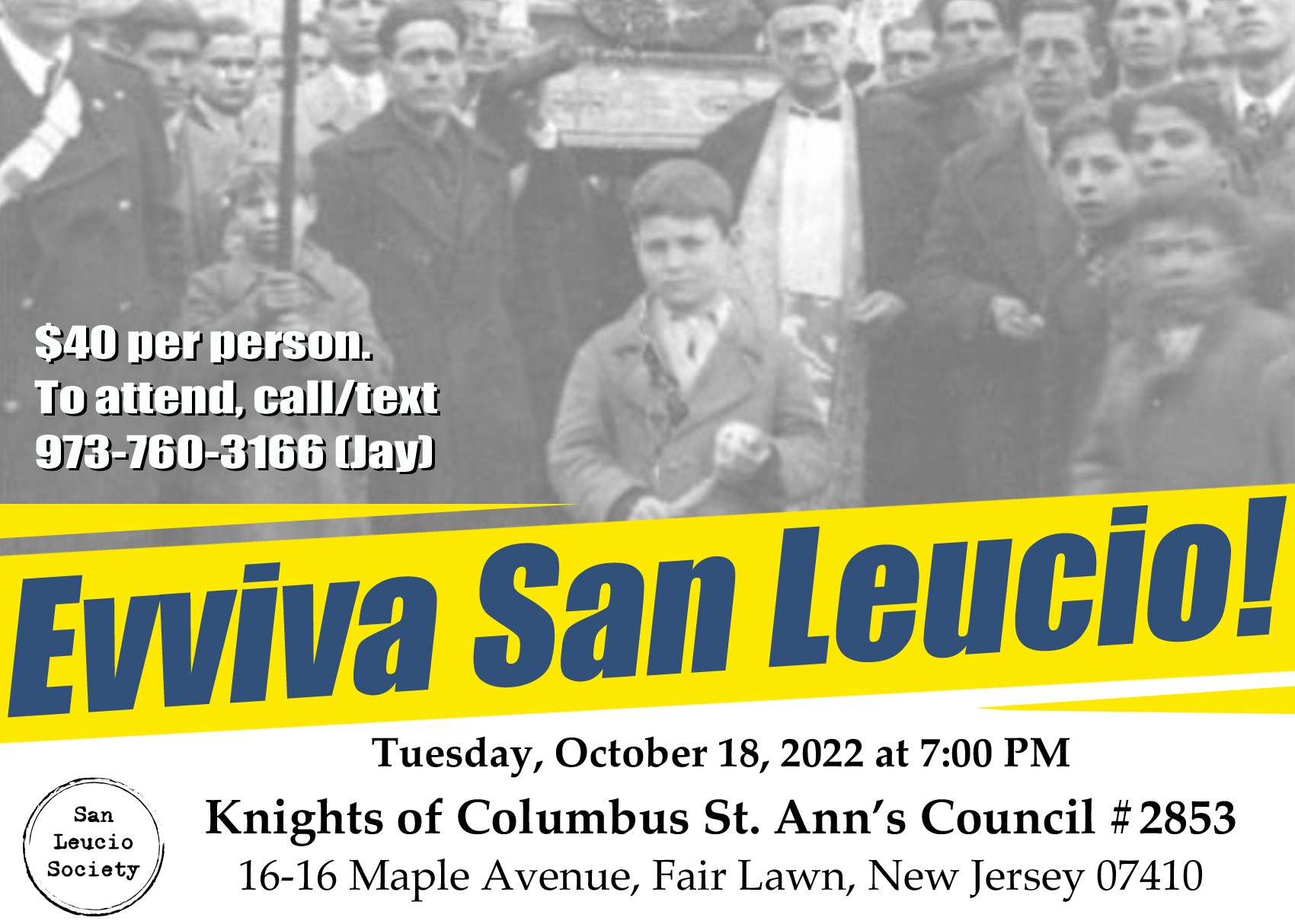 During the early 1900s, a wave of immigrants from San Salvatore Telesino ("sansalvatoresi") arrived in Paterson, New Jersey. During the 1920s, the sansalvatoresi established a devotion from their hometown. Each year on the last Sunday of July, the devotees would celebrate their town's patron saint, San Leucio. The celebration would include a mass (St. Michael's Church in Paterson) and statue procession/festa (St. Michael's Grove in Totowa).