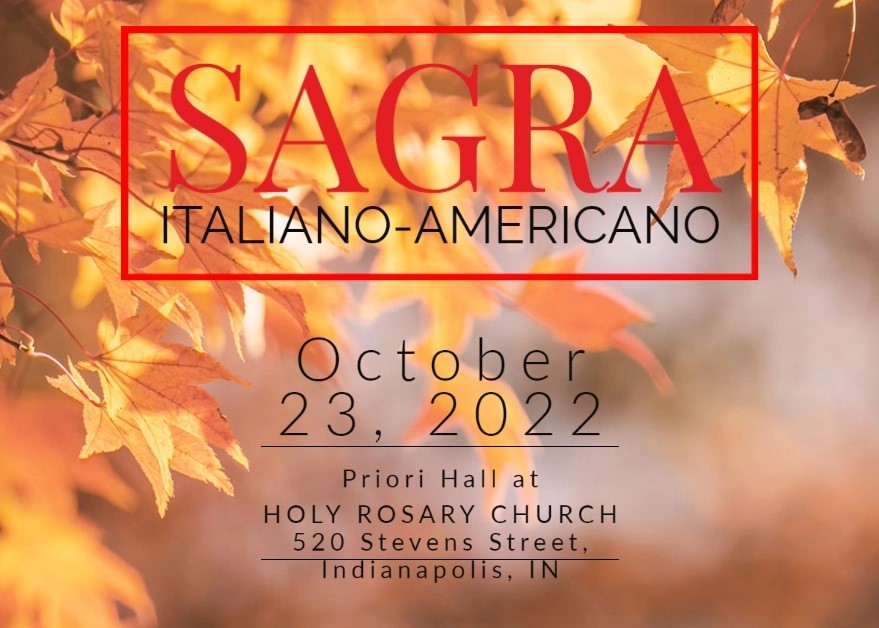 A celebration of Italian heritage and appreciation of membership. This members-only, no cost event is on Sunday October 23, 2022  from 2:30 – 5:00 PM. in Priori Hall at Holy Rosary Church, 520 Stevens St., Indianapolis IN. While a hot dish, water and soft drinks will be provided, each attendee is asked to bring a dish, salad, dessert or other beverage to share.