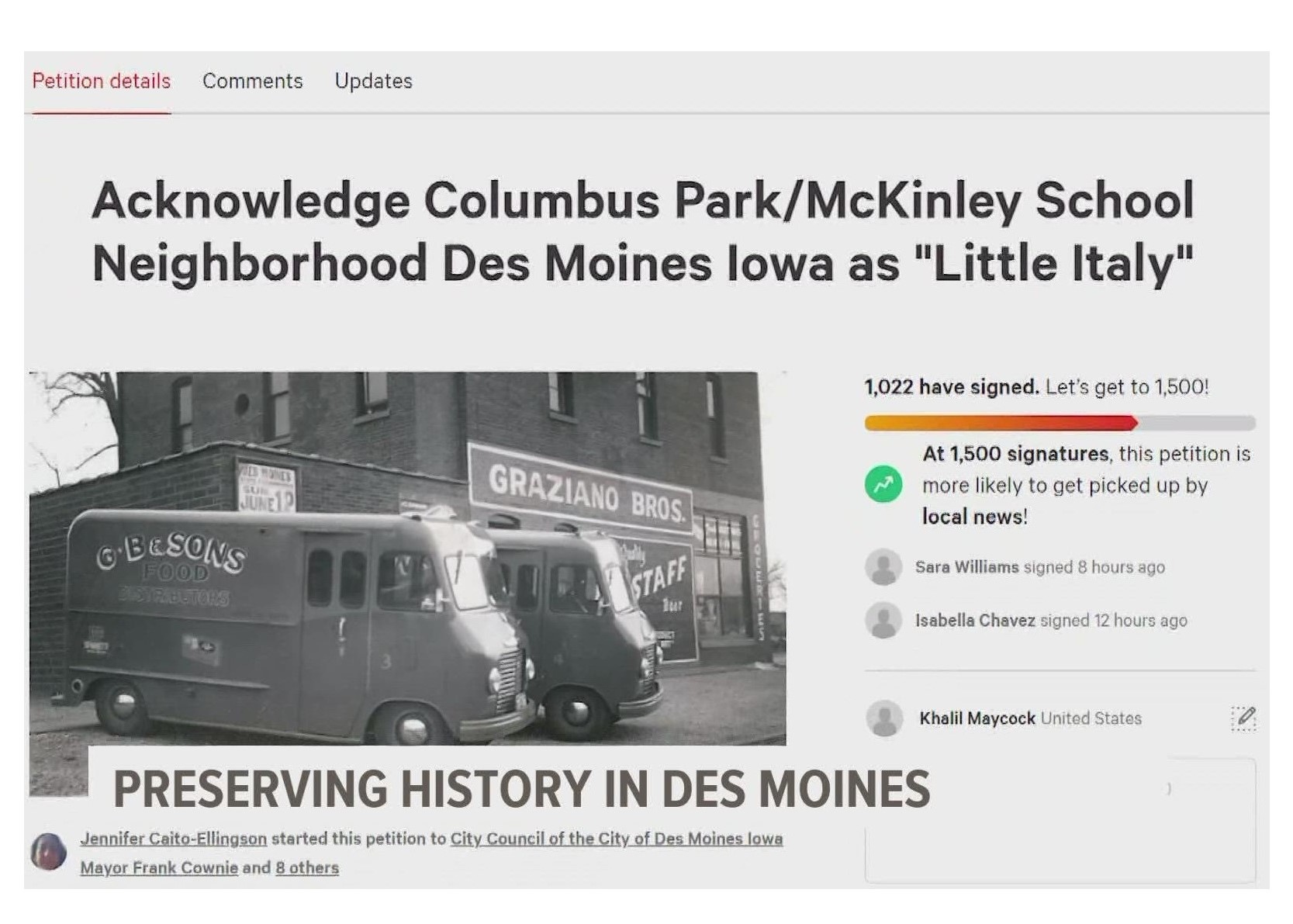 Little Italy DSM is working to get a business district on the south side of Des Moines designated as "Little Italy" to help preserve the community's history. The area along the south bank of the Racoon River includes Southeast First Street and East Jackson Avenue. Little Italy DSM co-founder Jenifer Caito-Ellingson said the neighborhood is rich with history and has notable cultural sites like Graziano Brothers and Tumea and Sons.