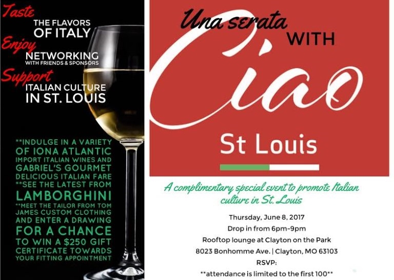 Thursday, June 8, 2017. Drop in from 6pm – 9pm. Rooftop lounge at Clayton on the Park. 8023 Bonhomme Ave | Clayton, MO 63103. Una Serata: A complimentary special event to promote Italian culture in St. Louis