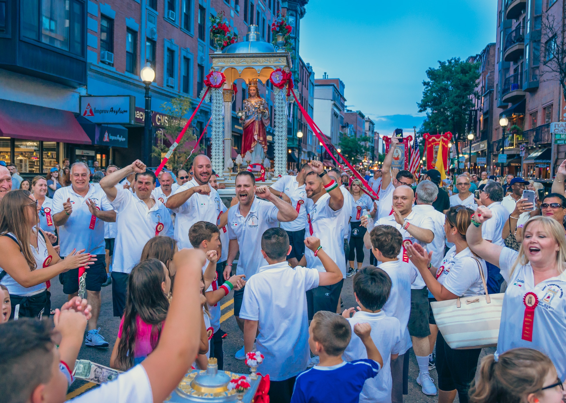 The 103rd Feast of Saint Agrippina di Mineo opened on Thursday night marking the start of the 2017 feasts in Boston’s North End. After a dedication, blessing and unveiling, the children’s procession led the way on Hanover Street followed by the large statue of Saint Agrippina to the Greenway before returning to her new weekend feast chapel. To carry the statue, 20 men coordinate in a complex rhythm to keep the 1600 pound heavy statue in the air.