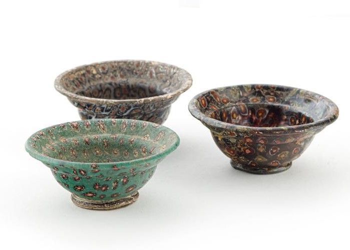 Romans invented ways to blow glass on a rod, and developed a technique for the intricate mosaic pattern as shown on these three wine cups. This colorful ornament in green, black, red, white and yellow glass is called “millefiori,” after Italian words for thousand and flowers.