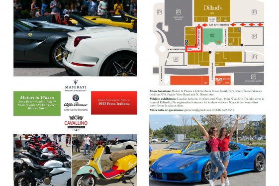 Kansas City's only all-Italian motorsports show--Motori in Piazza--returns on Sunday, June 4, Noon to 2pm, at Zona Rosa, in connection with UNICO KC's Festa Italiana (June 2, 3 and 4). Lamborghini, Maserati, Ferrari, Fiat, Alfa Romeo, Ducati, Moto Guzzi, Vespa and Lambretta! Free admission and no cost or pre-registration to display vehicles. For th...