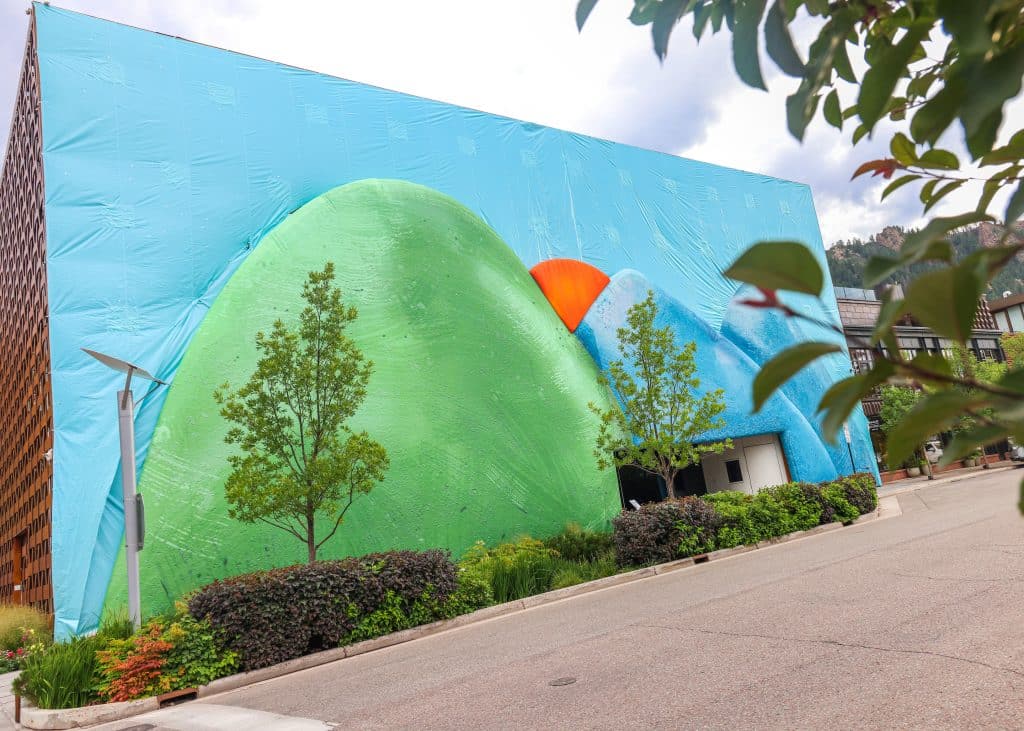 For the first time, he also took on an outdoor intervention on the museum’s façade, dedicated to Aspen Art Museum. The monumental site-specific and temporary public art portrays the title of his exhibition as boulder-shaped hills rise from the ground and gather in their green and blue shades. A triangular slice of orange material is positioned between the mountains to conform to its imagery as the sun, and at night, it emits a soft, warm light that marks the building’s landmark.