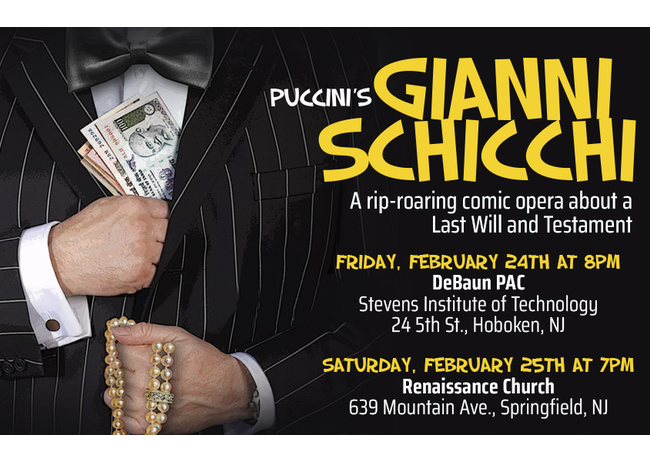 Saturday, February 25. 7:00 PM — 9:00 PM. Renaissance Church, 639 Mountain Ave, Springfield, NJ 07081. The Sopranos meet The Addams Family in NJFO's production of Gianni Schicchi, Puccini’s rip-roaring comic opera about a last will and testament.