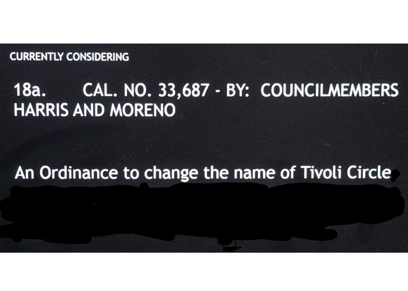 New Orleans City Council Ordinance 33,687 clearly states Tivoli Circle is being renamed numerous times. The slide on the monitor at the City Council meeting read: “An Ordinance to change the name of Tivoli Circle….” However, Harris’ Press Release stated that she made a motion to rename Lee Circle, which is the misinformation the press used.