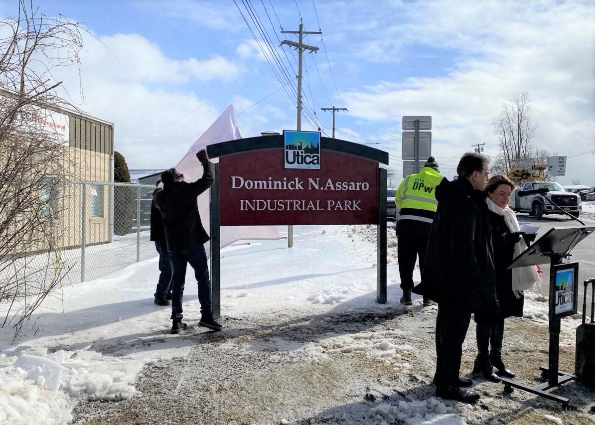 A sign was dedicated to Utica’s first Italian-American mayor, Dominick Assaro, in East Utica Friday afternoon. The sign sits at the Dominick Assaro Industrial Park on Dwyer Avenue. Assaro served as mayor of Utica from 1968 to 1971. Several of his family members gathered with city officials for the sign unveiling.