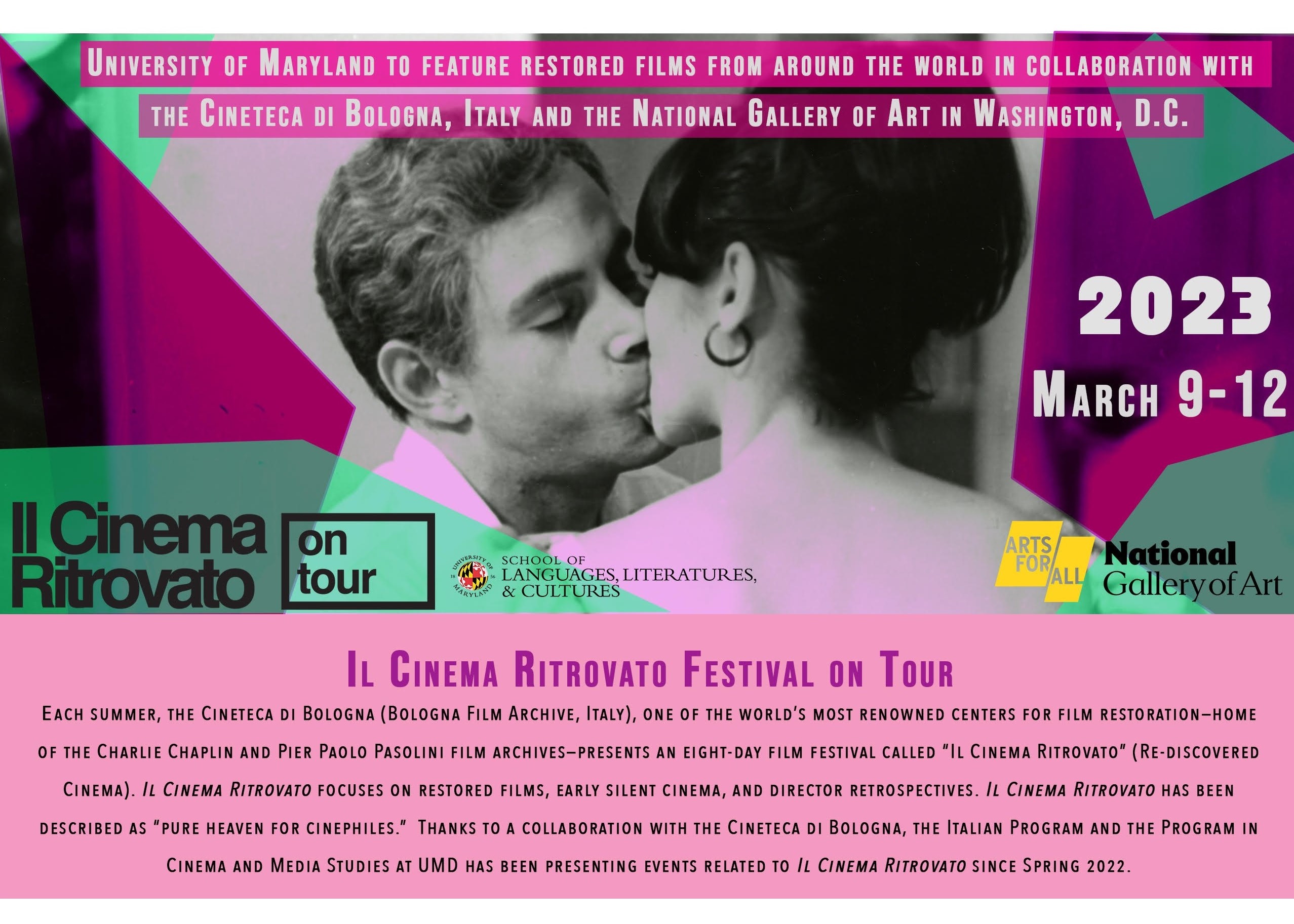 Il Cinema Ritrovato on Tour is a collaboration between the Italian Program and the Program in Cinema and Media Studies at the University of Maryland, College Park (UMD).