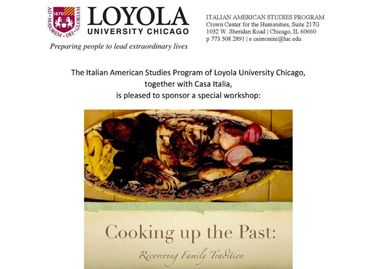 The Italian American Studies Program of Loyola University Chicago, together with Casa Italia, is pleased to sponsor a special workshop: "Cooking up the Past. Recovering Family Tradition". Led by Michele Fazio, Ph.D., Assoc. Prof. of English, University of North Carolina, Pembroke. Wednesday, October 9, 2019 at 7:00 Pat Casa Italia, 1621 N 39th Ave, Stone Park. IL 60165.