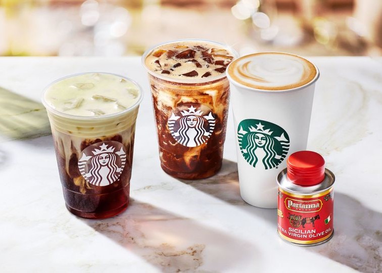 Starbucks wants you to give olive oil coffee a shot. Really. The coffee chain is rolling out a new line of beverages made with extra virgin olive oil. To be clear, the drinks are not simply flavored with olive oil, nor do they have just a hint of it. Each one is truly made with a spoonful of oil, adding 120 calories to the total. With some drinks, you can see a slippery sheen of oil in the cup, and you don't even have to squint.