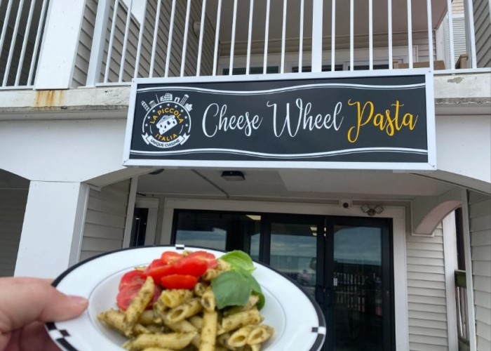 Cheese Wheel Pasta is located 1101 Atlantic Avenue in Ocean City, Maryland. It's right on the boardwalk, and although this place is small, it's BIG on flavor. Cheese Wheel Pasta, also known as Pasta Alla Ruota, is a dish that stirs hot, cooked pasta in a cheese wheel.