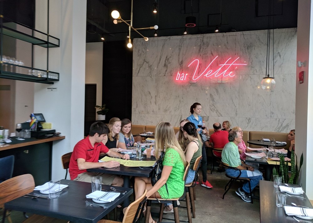 First of all, the clean, upscale feel of the place — the neon “bar Vetti” sign on the wall commands attention as soon as you walk in — doesn’t mean it isn’t a cozy spot to have a meal with friends and enjoy a cocktail or two. The restaurant is oddly situated in the ground floor of the 800 Building, just south of downtown, yet it somehow belongs.
