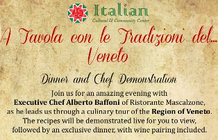 Join us for an amazing evening with Executive Chef Alberto Baffoni of Ristorante Mascalzone,as he leads us through a culinary tour of the Region of Veneto. The recipes will be demonstrated live for you to view, followed by an exclusive dinner, with wine pairing included.