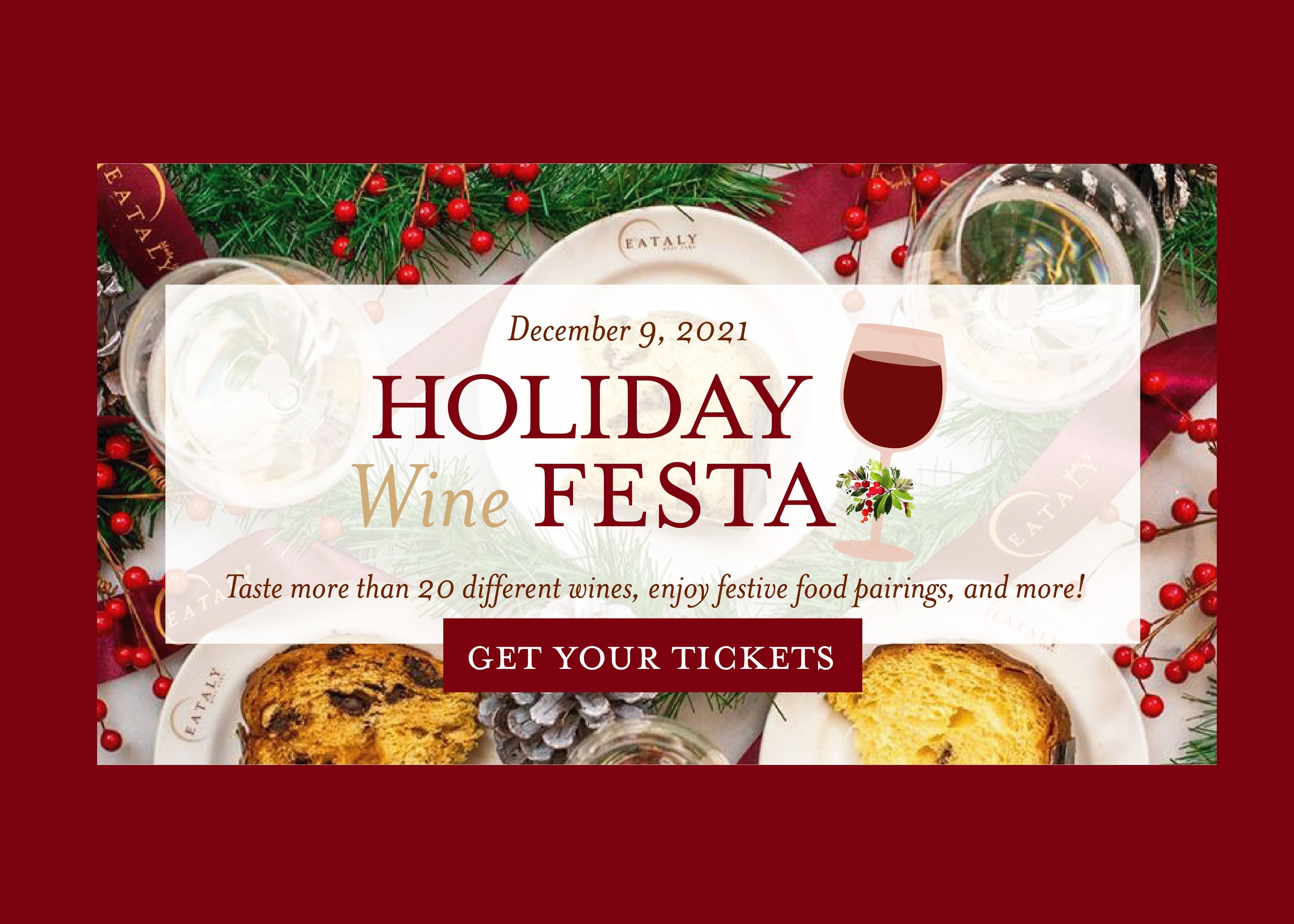 Celebrate the holidays at Eataly Dallas during Holiday Wine Festa on Friday, December 9. Taste more than 20 Italian wines, 6+ chef-crafted tasting stations, dozens of fluffy panettone, and more throughout our marketplace.