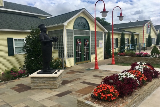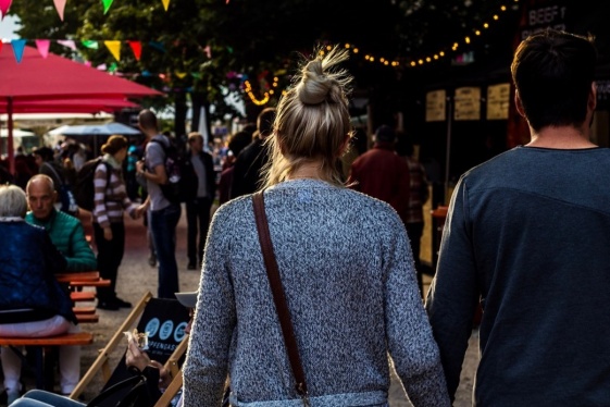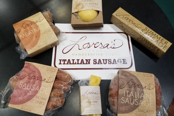 A couple walks through a gate beside Lovera's Handcrafted Foods and sets their sandwiches on a picnic table in the courtyard. They eat and talk with each other in the courtyard with an outdoor brick oven and vines overhead behind the century-old building that houses the Italian style market that's been internationally awarded for its specialty chee...