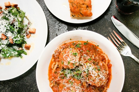 Their vegetarian slice starts with a foldable crust that has just the right amount of crunch, then builds with the DeNicolas' house-made marinara, mozzarella, ricotta, and basil pesto, with all of it topped with a careful drizzle of reduced balsamic vinaigrette. The balanced result is just about perfect.