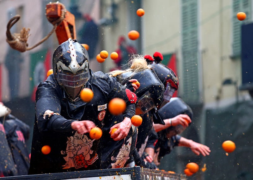 The Battle of the Oranges is highly regulated and steeped in tradition, as part of the longer Historical Carnival of Ivrea. Legend has it that Violetta, a beautiful miller’s daughter refused to comply with the local baron’s droit du seigneur (lord’s right), by which he was allowed to sleep with her on her wedding night.