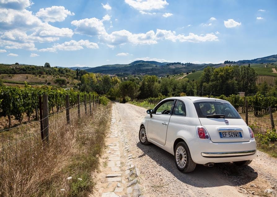 During a recent vacation I visited Tuscan wineries in a Fiat 500 car— known in Italy as a cinquecento (pronounced CHINK-way CHEN-tow). The word—rolling with alliteration—can apparently also add emphasis. The car is a mobile chunk of culture—compact and crammed with history, like the Italian Republic.