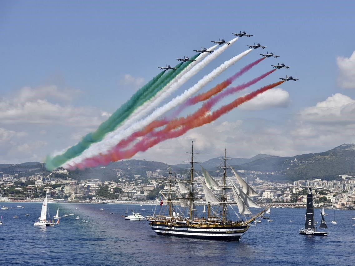 The salute of the Frecce Tricolori accompanied the historic tall ship as it began the docking maneuvers in front of Piazza Unità d'Italia, packed with joyful people surrounded by the Carabinieri Cavalry Band and the Bersaglieri. It was a special flyover because the Frecce Tricolori, founded on March 1, 1961, were celebrating their anniversary.