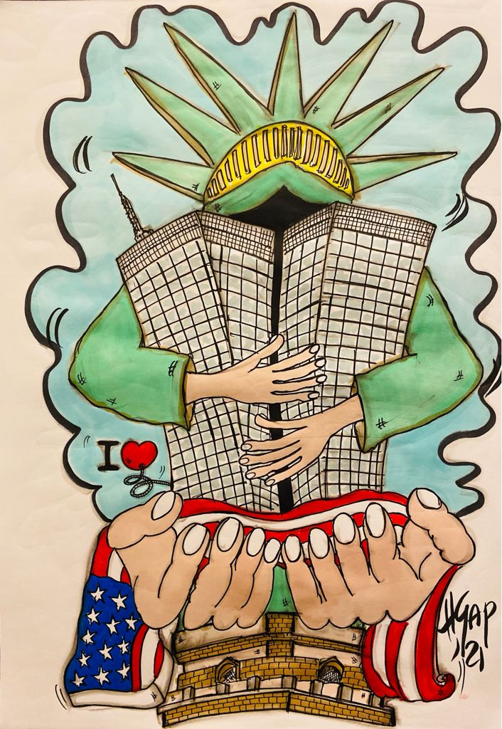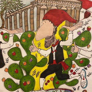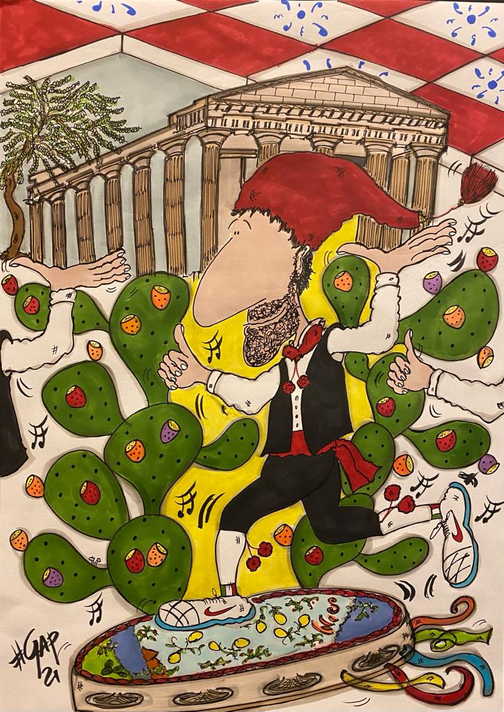 It all started like this: during the lockdown, he decided to start drawing again – a long lost passion just like music. “My father is a musician and a painter”, he explains, and he was a mentor when it came to these passions. He created a character, GAP, “a strange fella”. He started drawing him every night, travelling through space and time. Other than him, there were a few more recurring subjects in his drawings: Sicilian prickly pears (fichi d’india), references to American culture, and two tiny hands interacting with the viewer.