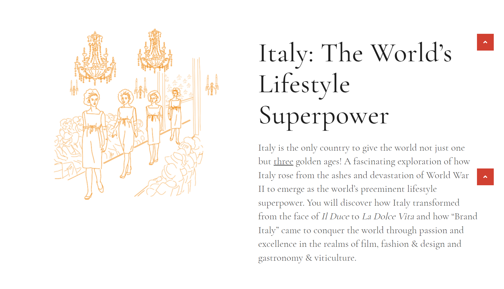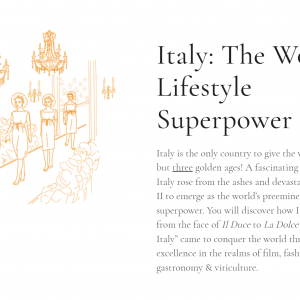 “Italy: The World’s Lifestyle Superpower” is one of my favorite lectures for at least two reasons. First, because it began with the realization that Italy is the only culture to have ever given the world not just one but three Golden Ages. The first two Golden Ages are of course familiar—ancient Rome and the Renaissance—but this current third Golden Age is one of lifestyle. Whereas the power of classical Rome was based on superior military force combined with superb organization (in building infrastructure and establishing governance), the glory of post-WWII Italy has been based on the power of attraction and persuasion: modern Italy has won the world’s heart.