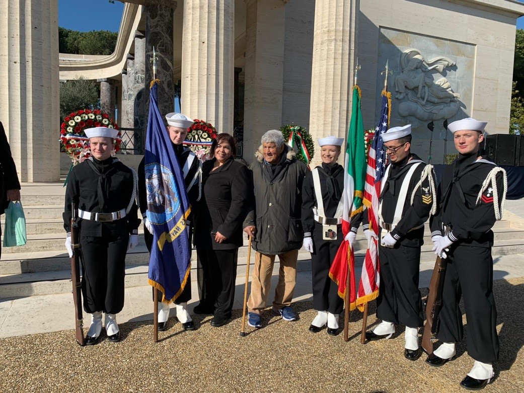 For instance, we are very close to schools that come often to the cemetery for group visits or to attend our ceremonies. Each year we hold a special ceremony, on January 22nd, to commemorate the Allied Forces Landing on the beaches on Anzio/Nettuno. For the past few years this ceremony has been led by students from a local middle school. The students pledge to learn about WWII and conduct research to learn more about the service members buried here. At the end of this program they hold a special “Memorial Day” ceremony at their school, which I attend and participate in as the Superintendent. The students present their findings creatively in a variety of categories such as dance, drama, song, poetry readings, and more. This program is sponsored by a local Italian man, Antonio Taurelli - 94 years old, who fought alongside the U.S. troops during their time here in Nettuno. Since the war, he continues to pay tribute to his fellow service members buried here at Sicily-Rome American Cemetery by laying single roses at five headstones.