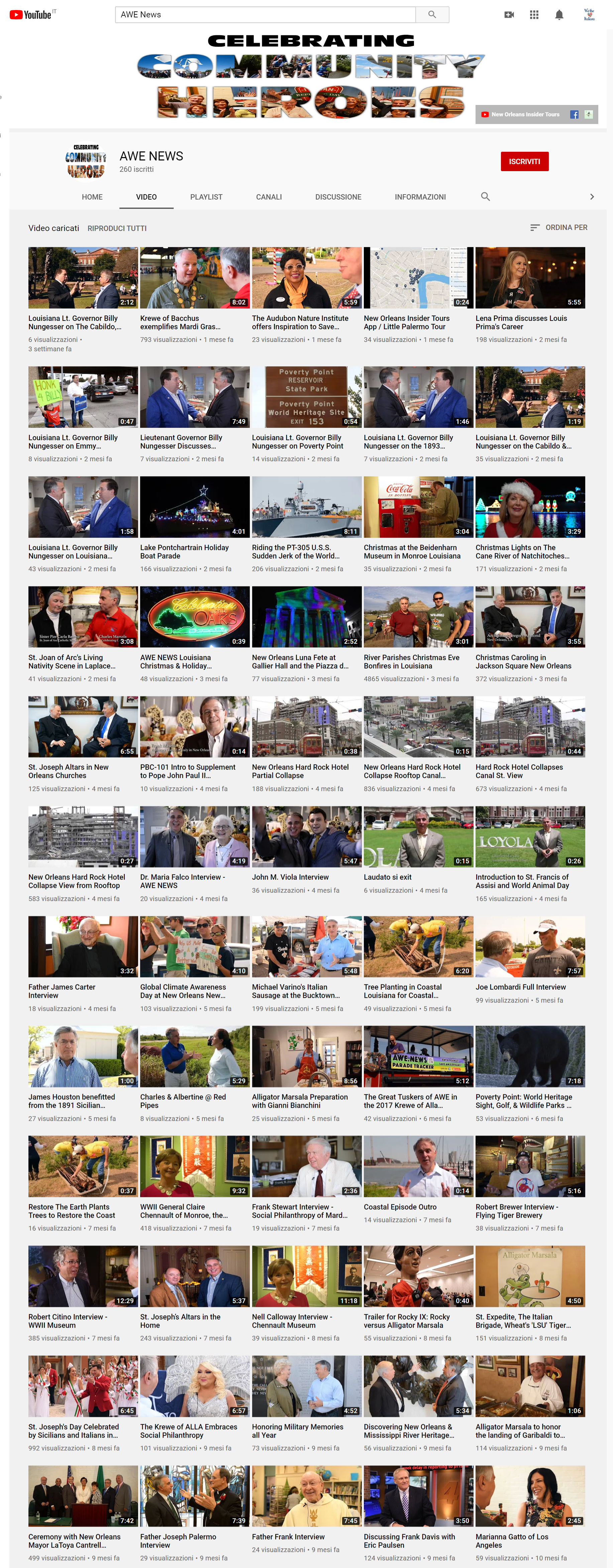 Finora abbiamo girato, ma non ne abbiamo ancora finito il montaggio, otto episodi sull’emigrazione siciliana a New Orleans. Ogni episodio è lungo 30 minuti. Si possono vedere sul nostro canale You Tube "Awe News".