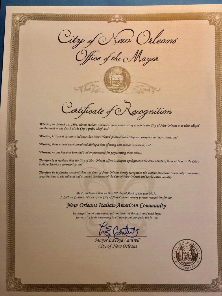 Last year you were among those who achieved an extraordinary result: the Mayor of New Orleans in person officially apologized to the Italian community for the shameful lynching of 11 Italian Americans in 1891, killed by an angry mob despite being tried and acquitted for the murder of the chief of police. How did you do this?