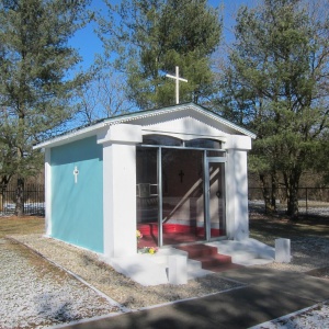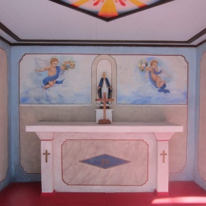 At some point, they asked the Commander if they could build a chapel. The Commander did give his permission, but the materials for it would have to be found in the camp. They began in earnest and the building has come to be known as the Chapel in the Meadow. They painted a crucifix, angels and the Madonna, St. Anthony, from pigments they made from berries, plants, even their own blood.