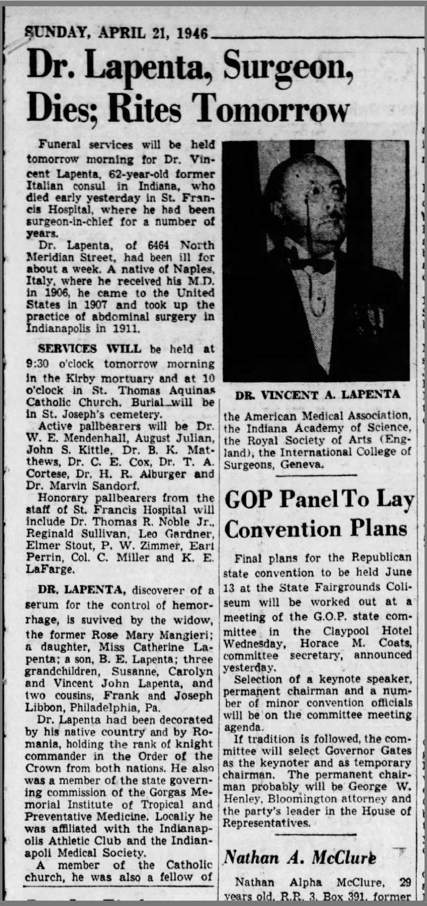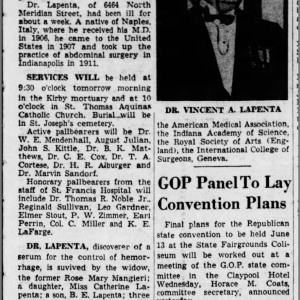 Dr. Lapenta is a fascinating person. He was born in 1883 on the island of Ischia, and raised in Naples. His father was an army officer who served under Garibaldi and they were a prominent family. Vincenzo got his medical degree in Naples and immigrated to the United States around 1906. He got another degree at Harvard Medical School and then he decided to come to Indianapolis, most likely because we had no doctor here to serve the Italian community. He arrived in Indianapolis around 1910.