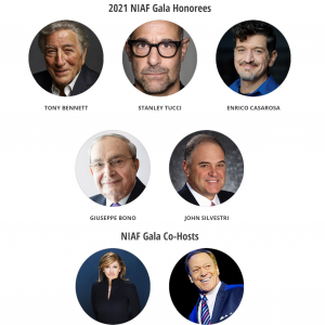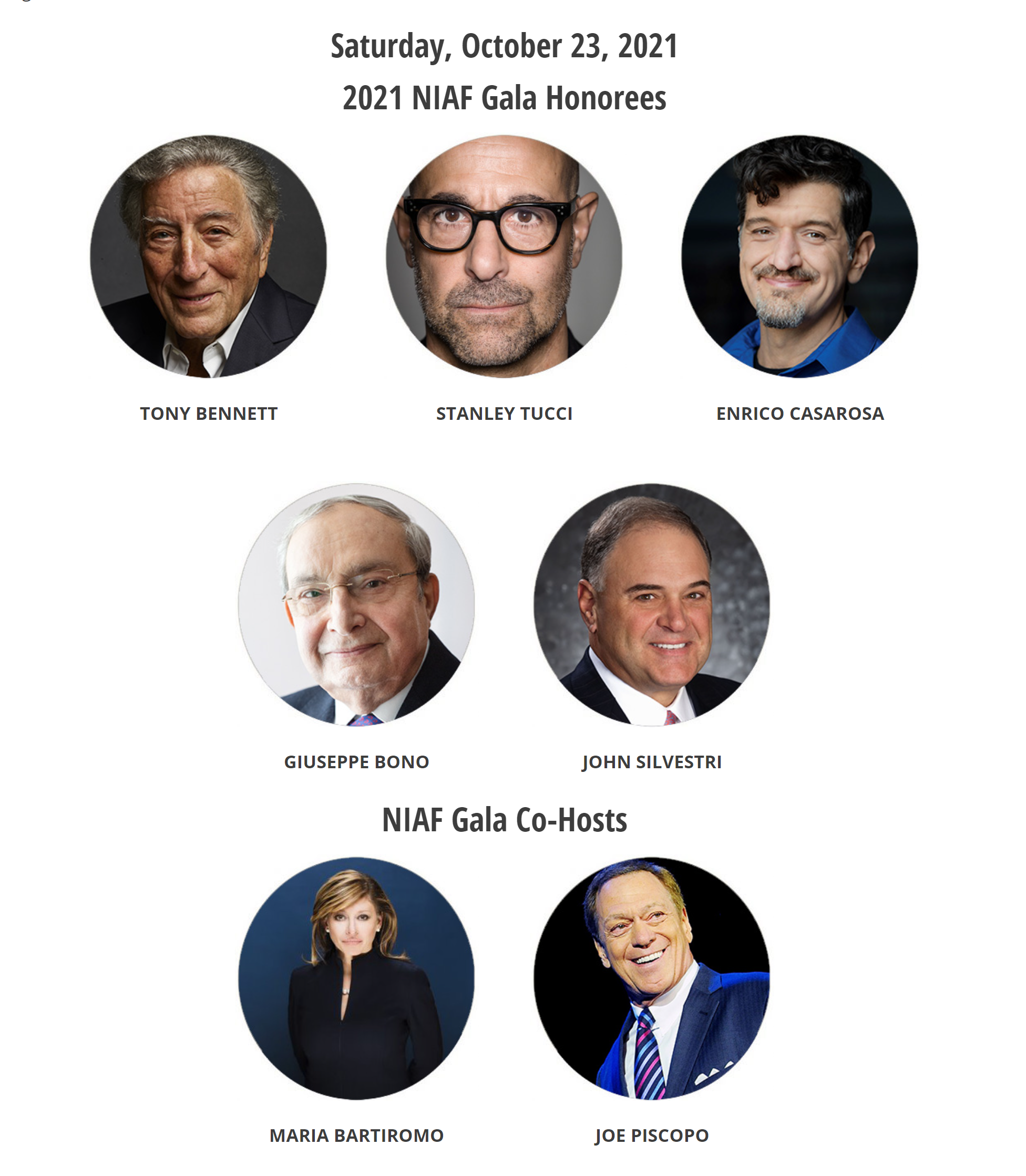 Anche quest'anno, onoreremo un gruppo eccezionale di italiani e italoamericani meritevoli al nostro gala a Washington D.C. il 23 ottobre. La regione d’onore è l’Abruzzo. Tra i nostri premiati ci saranno il leggendario cantante Tony Bennett, il famoso attore e presentatore Stanley Tucci, il produttore cinematografico Enrico Casarosa, l'uomo d'affari John Silvestri e il CEO di Fincanteri Giuseppe Bono. Quest'anno, a causa delle continue restrizioni di viaggio per i cittadini dell'area Schengen, stiamo progettando un gala più piccolo e intimo e, per necessità, alcuni dei nostri premiati ritireranno i loro premi virtualmente. Abbiamo intenzione di confezionare una versione on-line del gala in modo che possa essere vista da tutti gli amici interessati della NIAF in tutto il mondo poco dopo il gala in persona. Ci piacerebbe che i lettori di We the Italians partecipassero di persona al nostro gala, ma se non possono, porteremo il gala da loro con la nostra successiva trasmissione.