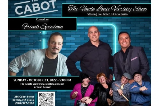 Sunday, October 23, 2022 at 5:00 PM. The Cabot, 286 Cabot St, Beverly, MA. Get your tickets now! "The Uncle Louie Variety Show" has been making audiences laugh for years with its hilarious and unique take on growing up as an Italian-American. The show is composed of two dynamic comedians, Lou Greco and Carlo Russo, who have gained international pop...