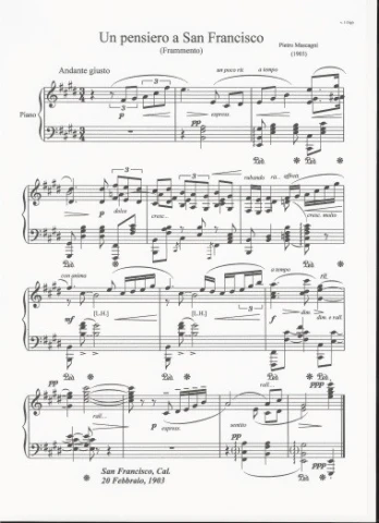 Such a reception did not leave the composer cold. On February 20, 1903, he composed a short fragment for piano entitled Un pensiero a San Francisco (A Thought for San Francisco), published the following day: "Never before has a great composer written music in this city", declared Stevens, "Mascagni, in joyous mood, makes this message for people of his own heart in universal language of melody for those who have made him forgetful of troubles under these blue skies."