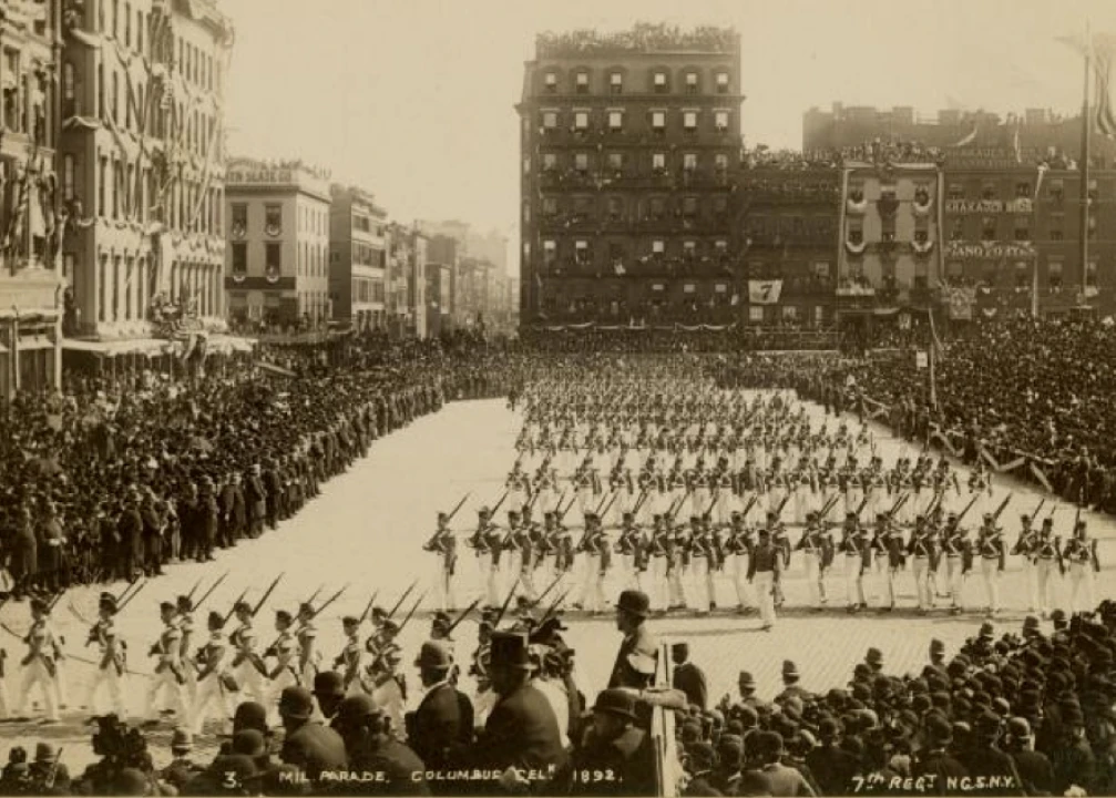 Columbus Week was a completely decked out party with a Hudson River naval parade, Brooklyn Bridge fireworks, a music festival, and the first Columbus Day Parade, which consisted of 12,000 public school children, 5,500 Catholic school children, military drill squads, and 29 marching bands.
