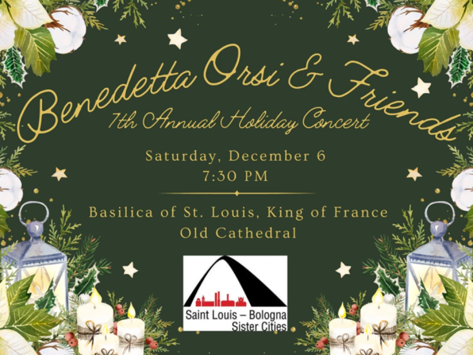 The St Louis - Bologna Sister Cities proudly invites you to its 7th Annual Italian Christmas Concert: Benedetta Orsi & Friends - Saturday, December 6, 2025 at 7:30 PM - The Old Cathedral - Basilica of Saint Louis, King of France - 209 Walnut Street, St. Louis, MO 63102 (Free and secured parking available on site)