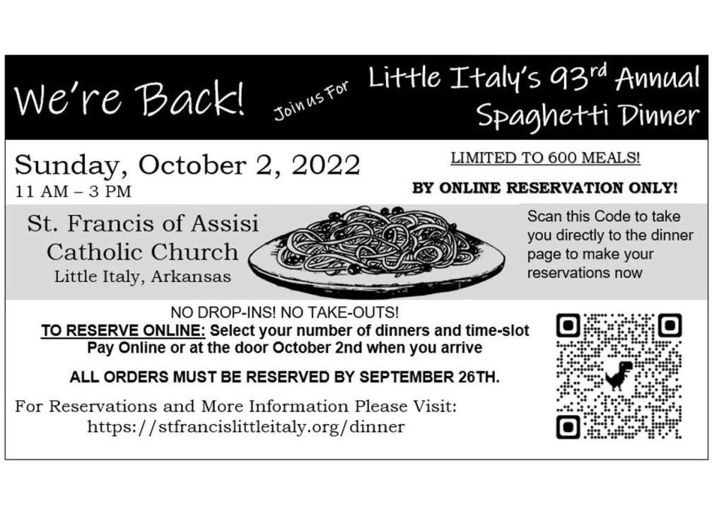 St. Francis of Assisi 93rd Annual Spaghetti Dinner: Sunday October 2nd. After a 2 year hiatus, the St. Francis of Assisi Catholic Church Spaghetti Dinner in Little Italy, Arkansas has returned and hope to see you there! ST. FRANCIS OF ASSISI CATHOLIC CHURCH ADDRESS: 33223 Highway 300, Little Italy, Arkansas 72135. Reserve Now here.