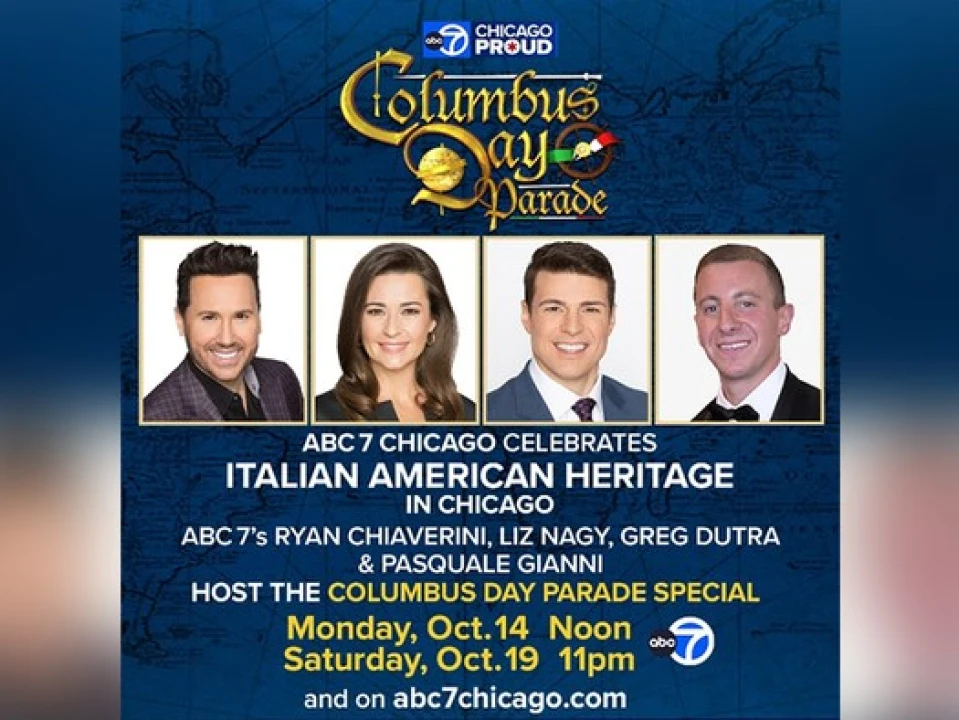 ABC7, Chicago's most-watched television station, is celebrating the city's vibrant Italian American community, with the broadcast of the 72nd annual Columbus Day Parade. The live event is hosted by ABC7 sports anchor and "Windy City Weekend" host Ryan Chiaverini, reporter Liz Nagy and meteorologist Greg Dutra, reporting all the festivities from the street.