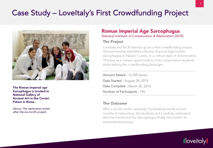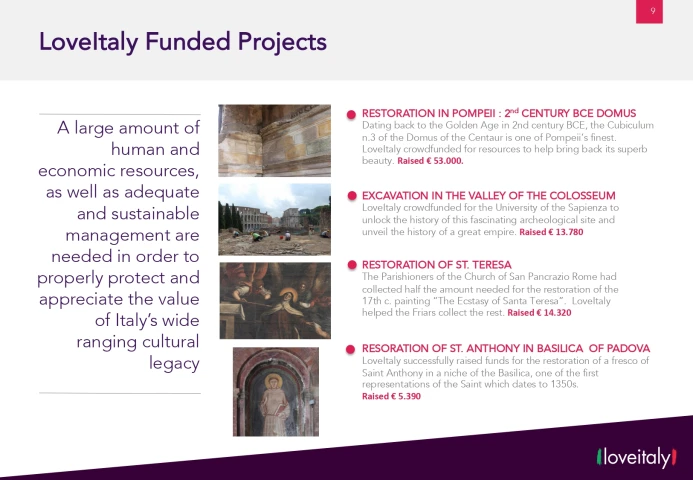 LoveItaly was founded in 2014 by a group of enthusiasts from diverse professional backgrounds who are passionate about Italy’s cultural heritage and seek to make the conservation of Italy’s outstanding artistic treasures their main focus.
