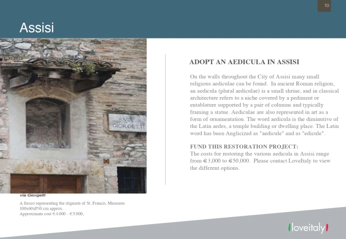 Attualmente stiamo collaborando con il Comitato del gemellaggio tra San Francisco, California, e Assisi, Italia. I membri di San Francisco hanno avviato una campagna di raccolta fondi per "adottare" e restaurare le Edicole e gli affreschi murali di Assisi, a partire da quello di Via Frate Elia, la strada che conduce alla magnifica Basilica di San Francesco ad Assisi. Questi gioielli del XVII secolo, purtroppo, stanno lentamente scomparendo con il tempo. Ai tempi degli antichi romani, l'edicola era un piccolo santuario che spesso appariva sui muri delle città con divinità pagane che proteggevano una casa o una strada. Le lampade a olio del santuario illuminavano le strade molto buie. Con l'arrivo del cristianesimo, le immagini pagane furono sostituite da quelle cristiane.